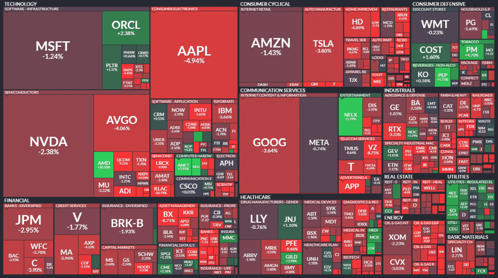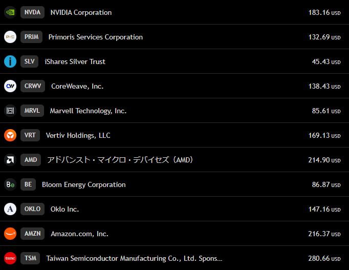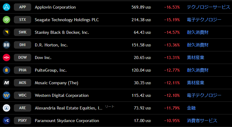 こんなときに売られるのがテクノロジーなんですが、アップルが下落トップ10に入ってるだけでほかのエヌビディアとかは前半の貯金のおかげで衝撃は緩和されました。
