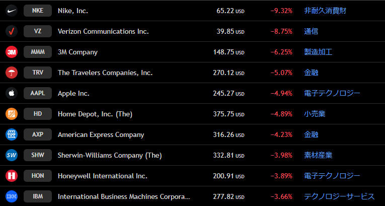 ダウ 週間下落ランキングトップ10