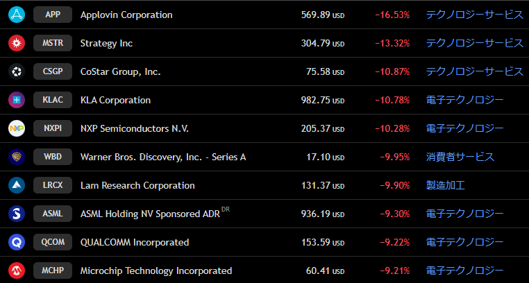 ナスダック 週間下落ランキングトップ10