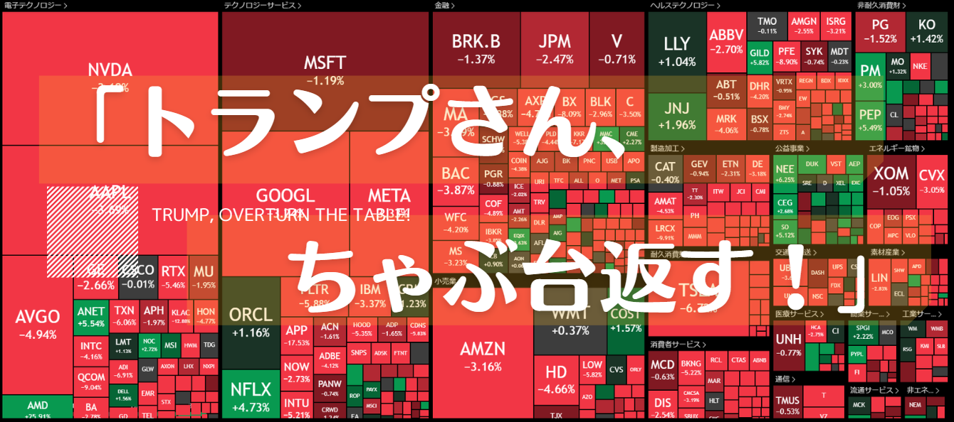 トランプさんが週末にちゃぶ台返しをしたので、銘柄もへったくれもなくなってしまいました。