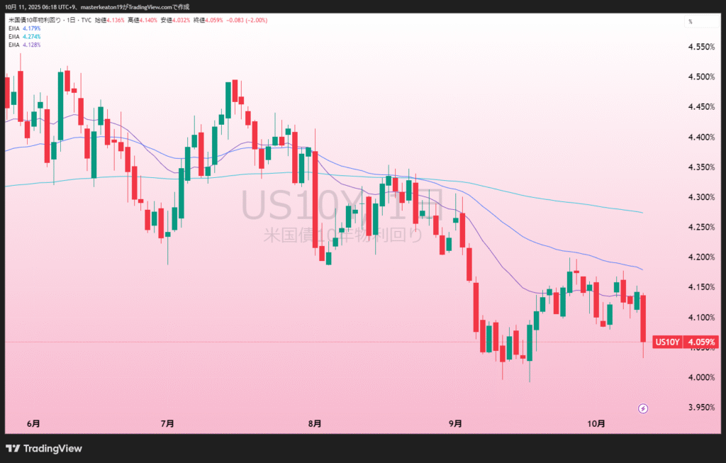 こちらも週末の関税ショック的なニュースでリスク回避の債券買いがはいったと思われます。