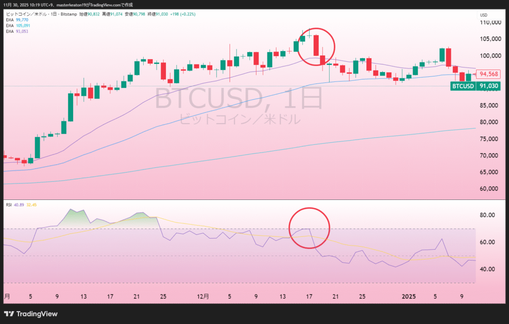 もう11月から買われすぎがずっーーと続いて赤丸のFOMCをきっかけに売ってきました。