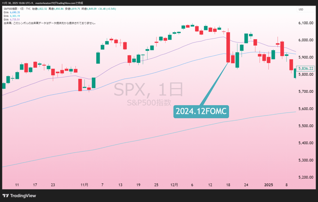 2024年12月このときのパウエル議長の発言は完全ハト派だったのですが、売りたいムードできっかけ見つけて売り払ったといった状況でした。
