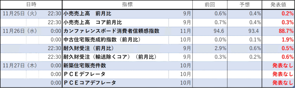 • 11月の米消費者信頼感指数は88.7と7カ月ぶりの低水準となり、市場予想(93.2)を下回った。