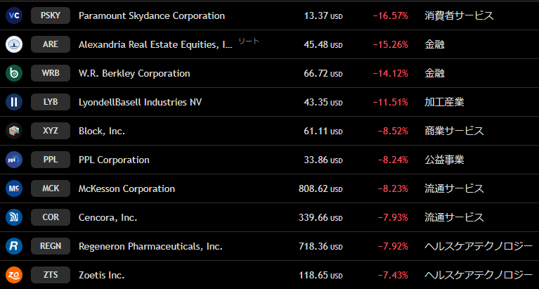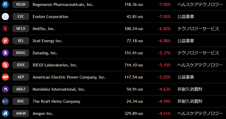 ナスダック 週間下落ランキングトップ10