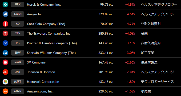 ダウ 週間下落ランキングトップ10