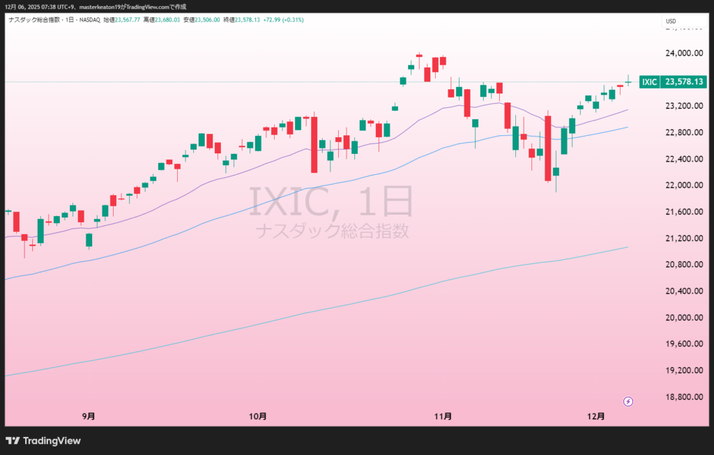 - ナスダックが+0.9%(23578.13)