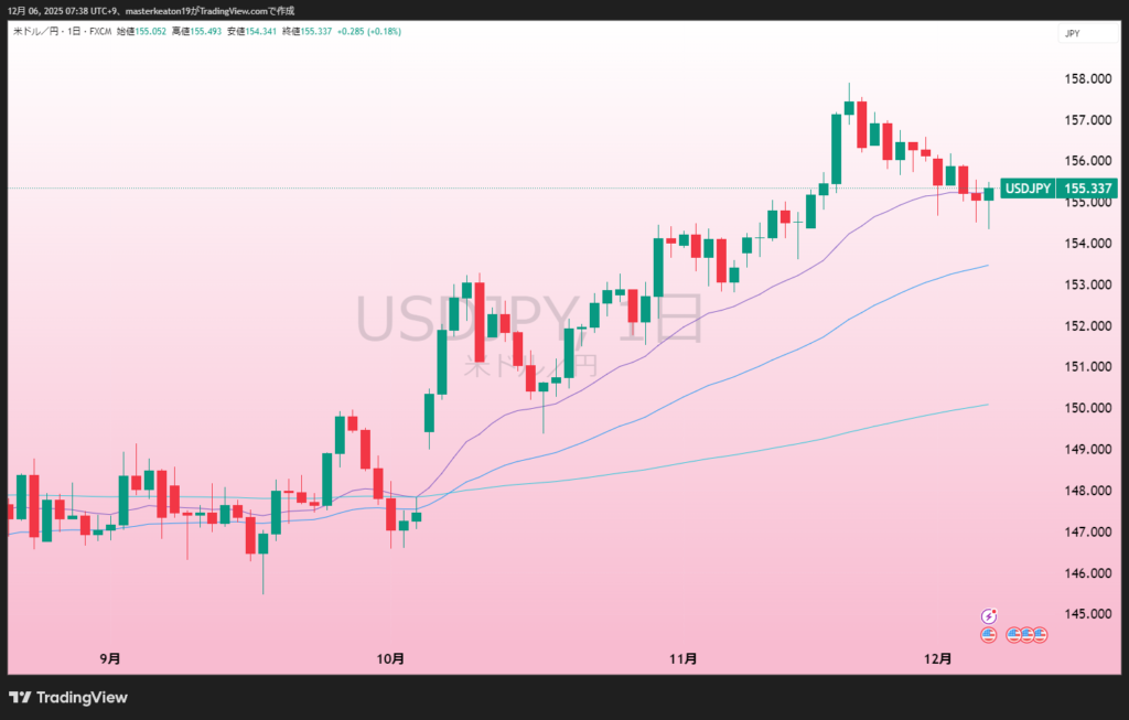 155.34円/ドルと先週から下落です。
