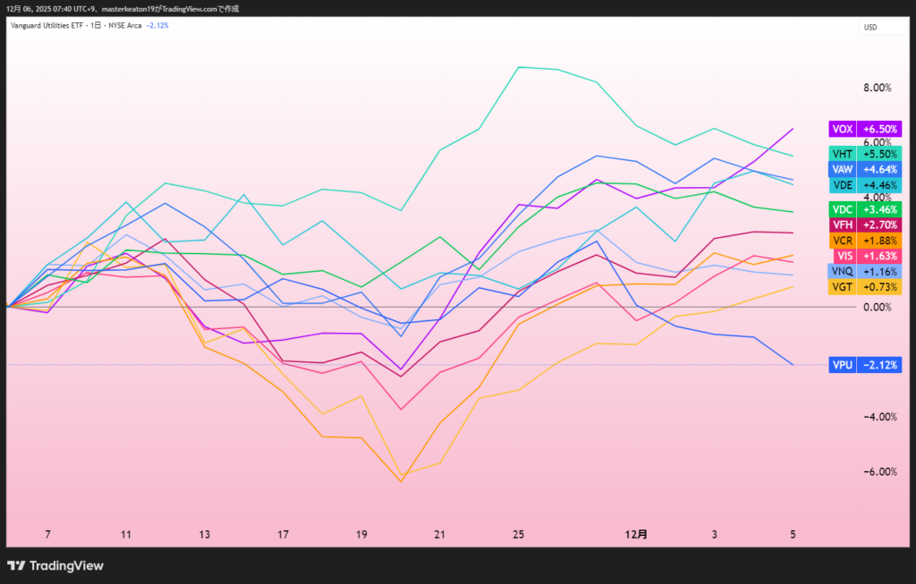 下図をご覧下さい。1か月のセクター毎の株価指数の推移です。