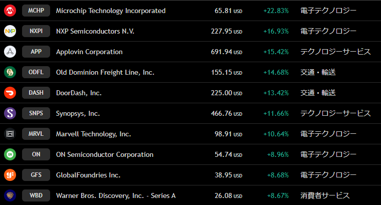 上昇トップ3位のNXPIですが、チップメーカーで、さきほどのマイクロチップ・テクノロジー (MCHP)につられて上昇した感じですね。
