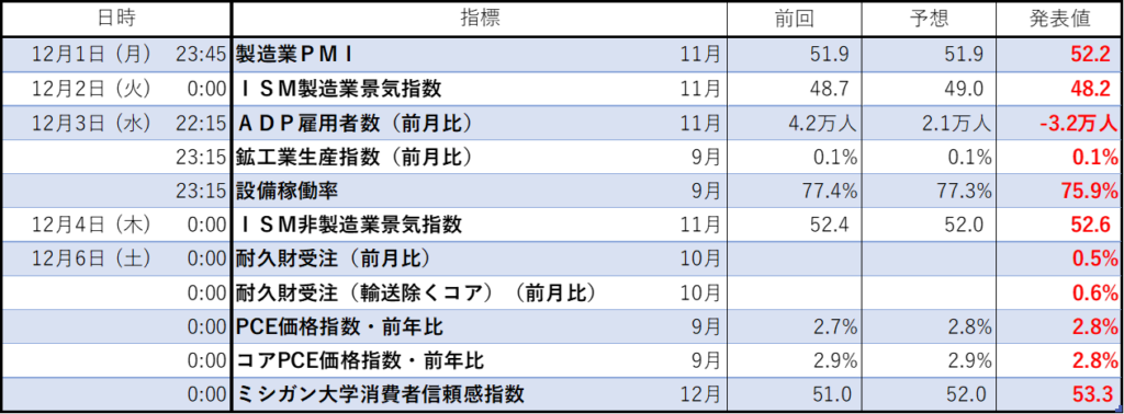 今週のイベント結果(経済指標の結果)