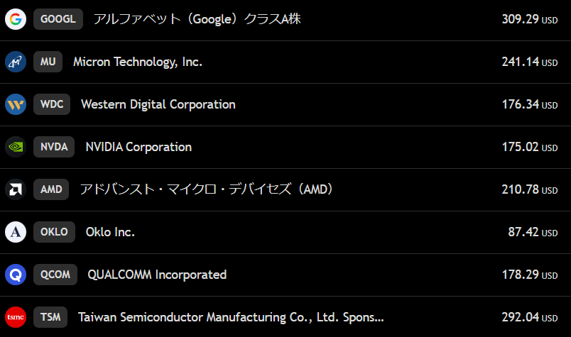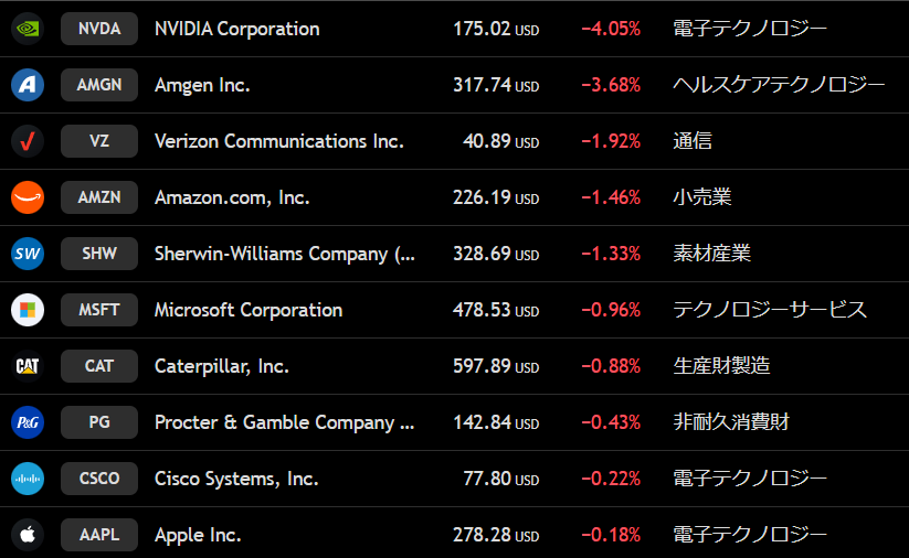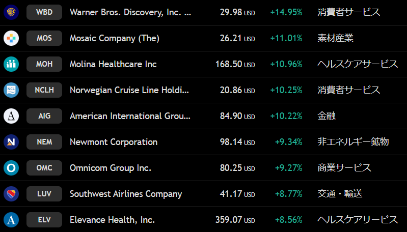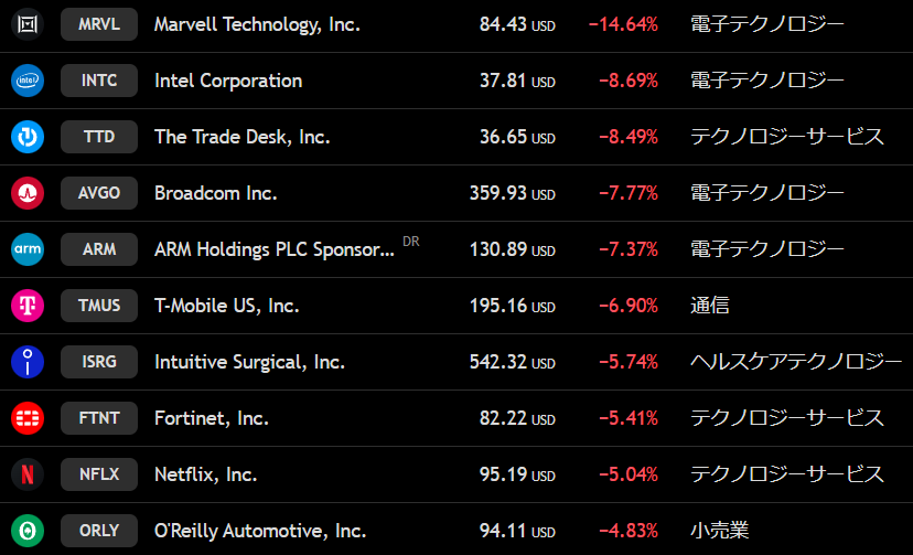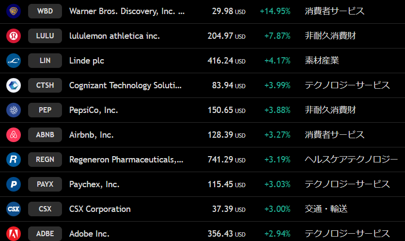 上昇トップは今買収話題のワーナーブラザーズ(WBD)でして、下落トップ10にはしっかりブロードコム(AVGO)が入っております。