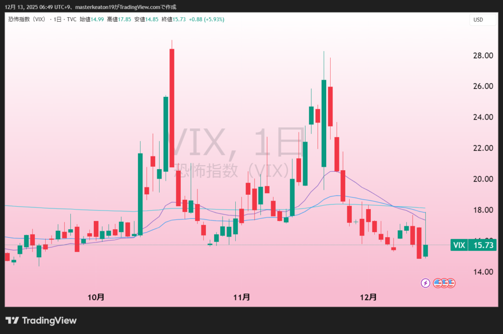 AI企業の業績懸念により一時18程度まで上昇しましたが、なんとか15台でおちついております。これが来週も尾を引くかというとさすがにそれはないような気がします。