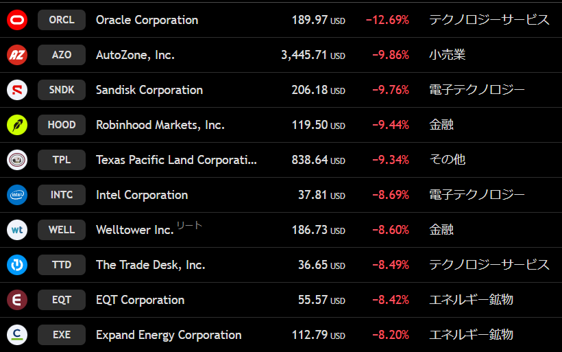 下落トップにはしっかりオラクル(ORCL)がダントツでして、これもここまで売られるか?というくらい売られました。