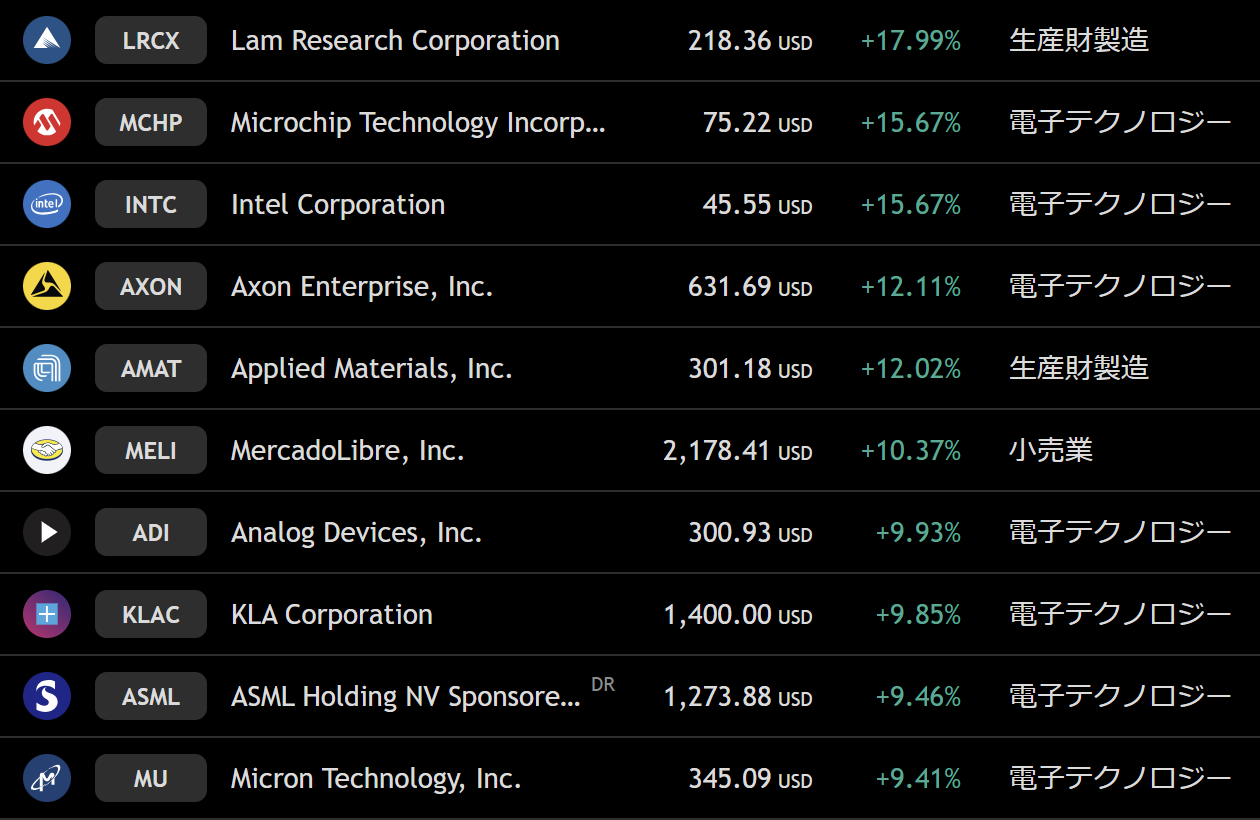 ナスダック 週間上昇ランキングトップ10