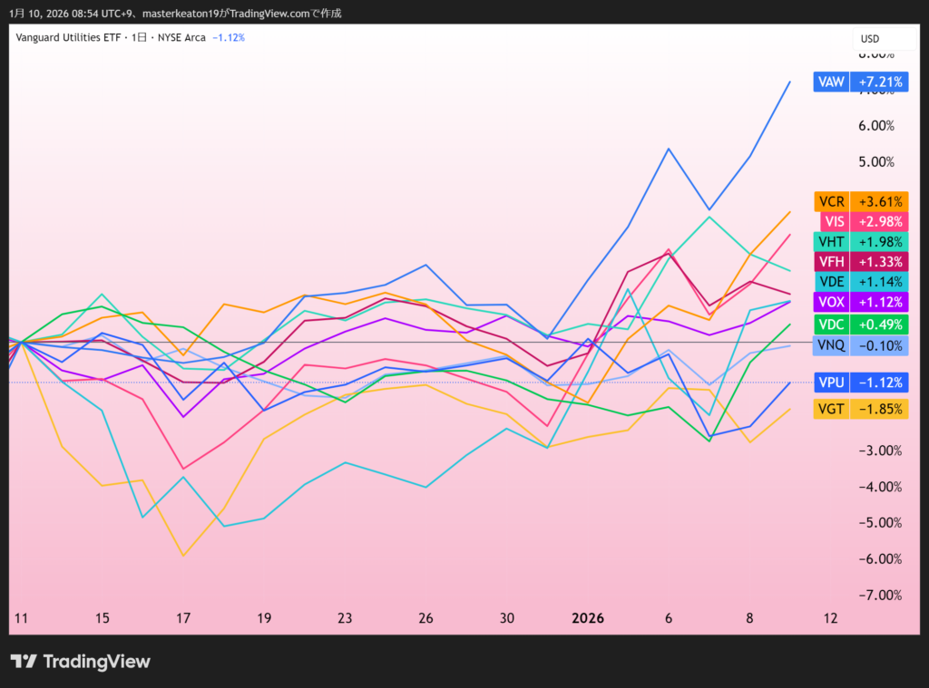 VAWの素材が先週に引き続きトップですが、これって金銀銅の安全資産への投資とAI関連のツルハシ狙いのような気がします。金銀銅だけでなくあらゆる素材が必要になってきているのではと思います。
