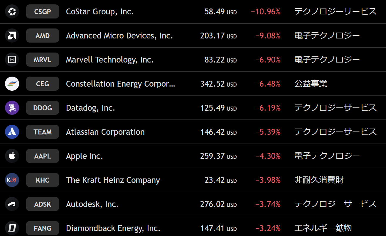 ナスダック 週間下落ランキングトップ10