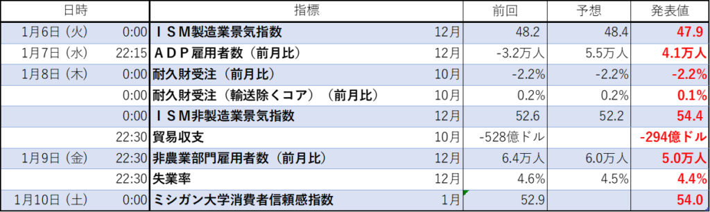 今週のイベント結果(経済指標の結果)