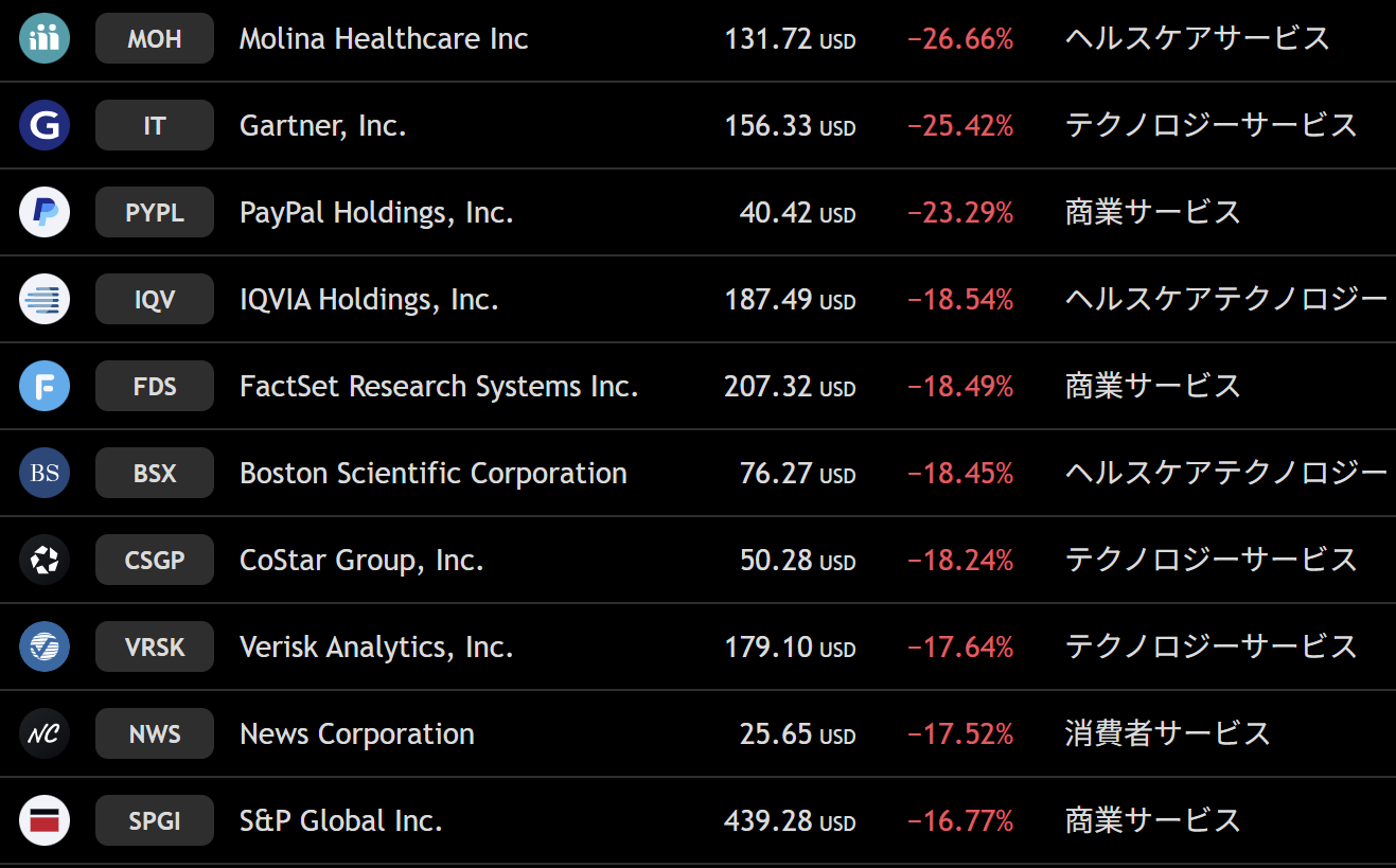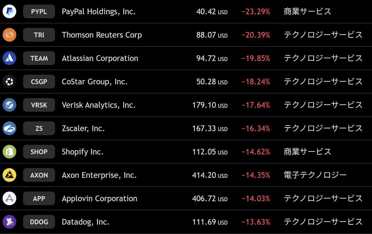 ナスダック 週間下落ランキングトップ10