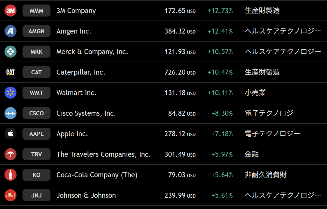上昇トップは3M。要因は取締役の新任と財務体制の強化ということで、RTX(旧レイセオン)のCFOが、社外取締役に就任したことが好感され、豊富な財務経験が3Mのガバナンスと財務戦略を強化すると期待されたとのことです。