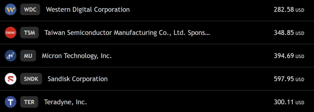 サンディスク(SNDK)もう一回入りました。ちなみにウェスタンデジタル(WDC)から分社化した会社です。