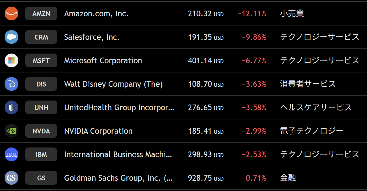 ダウ 週間下落ランキングトップ10