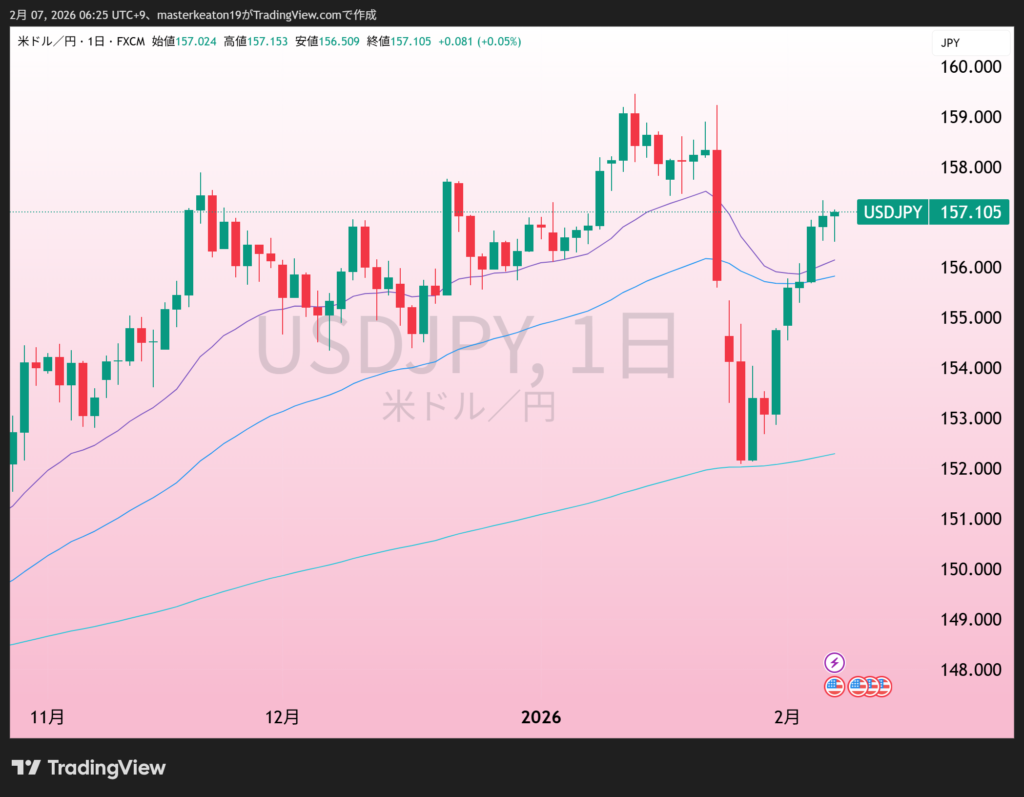 157.11円/ドルと先週から2円強上昇です。