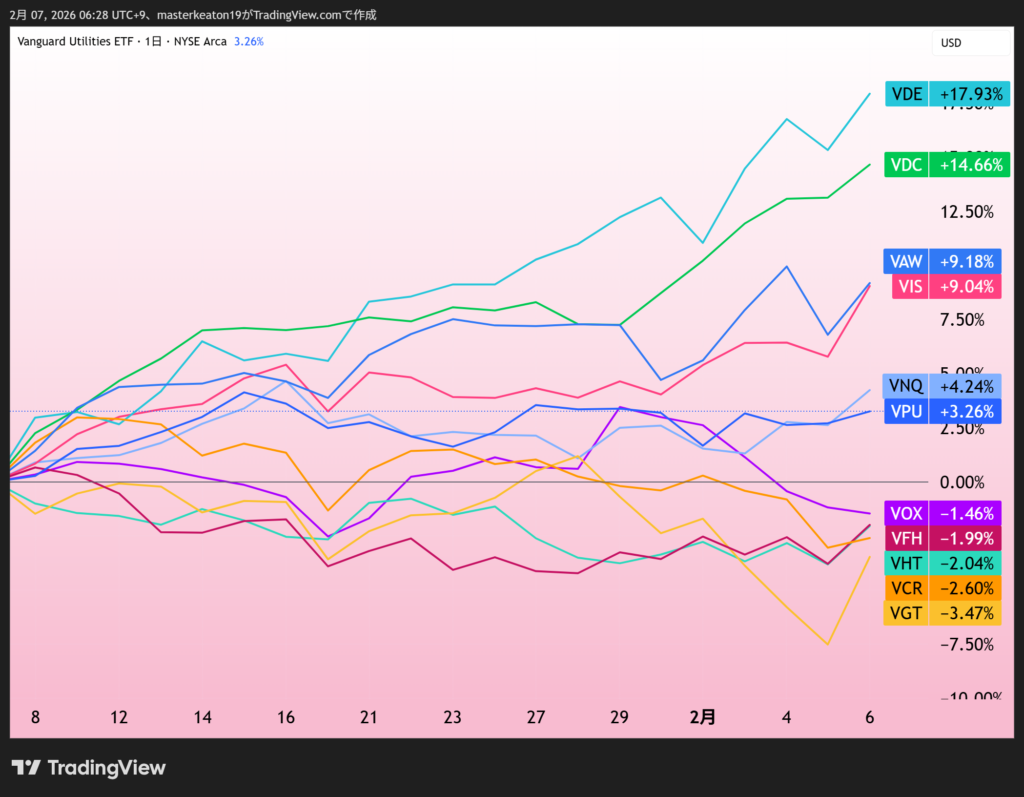 下図をご覧下さい。1か月のセクター毎の株価指数の推移です。