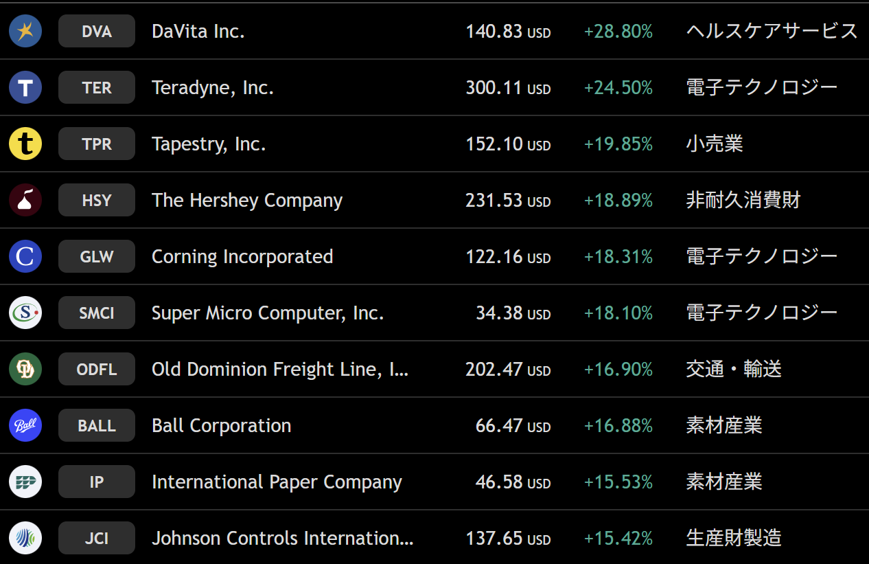S&P500 週間上昇ランキングトップ10