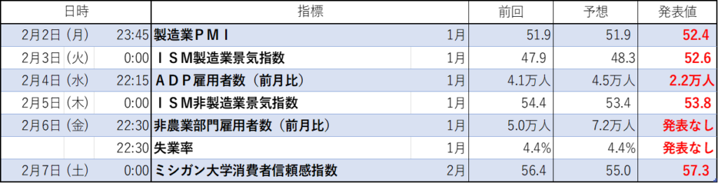 • ISM指数とインド関税:1月のISM製造業指数が予想を上回り、1年ぶりに50超。トランプ氏が対インド関税引き下げを表明し、貿易摩擦懸念が和らいだことで週初はダウが反発した。
