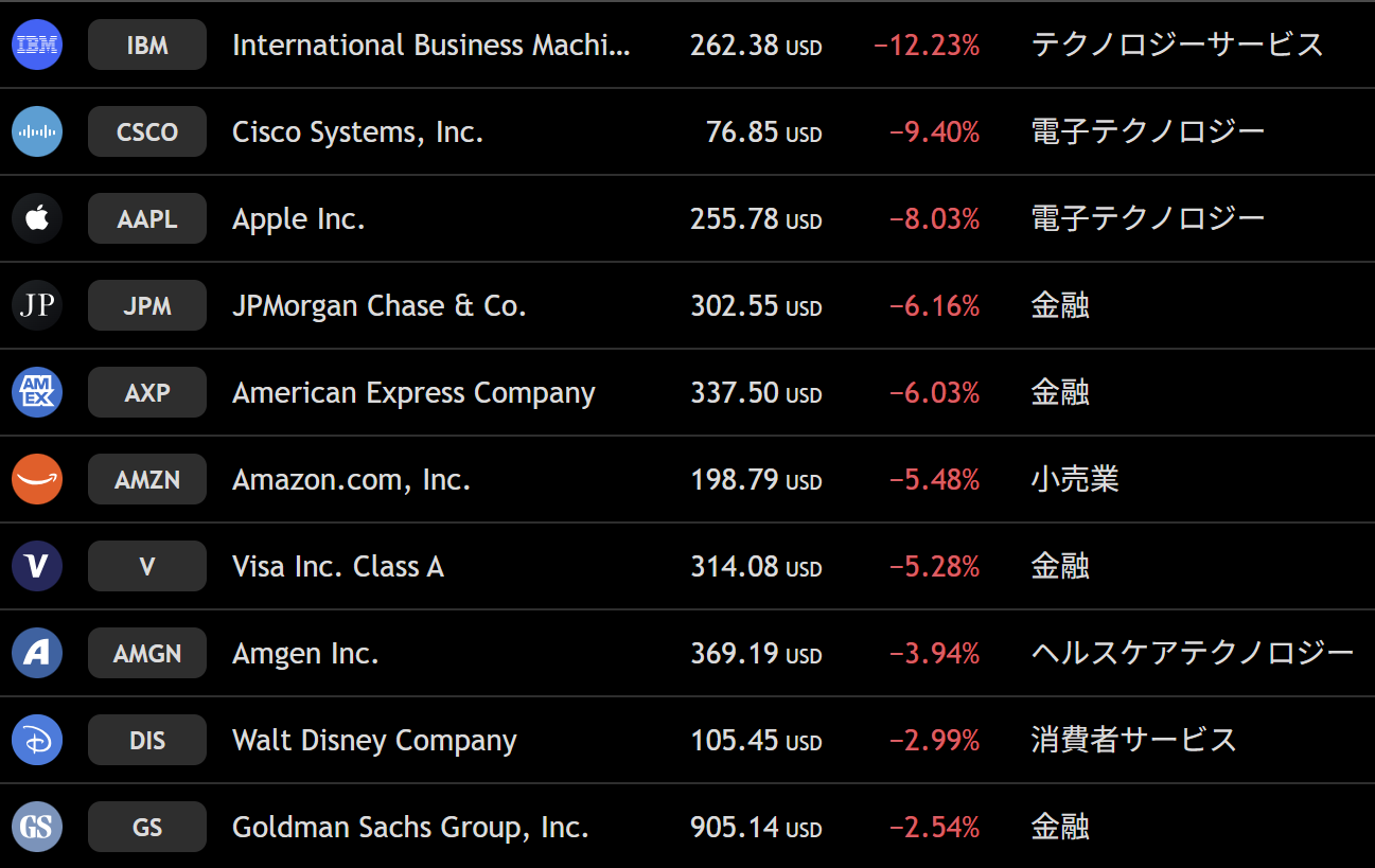 ダウ 週間下落ランキングトップ10