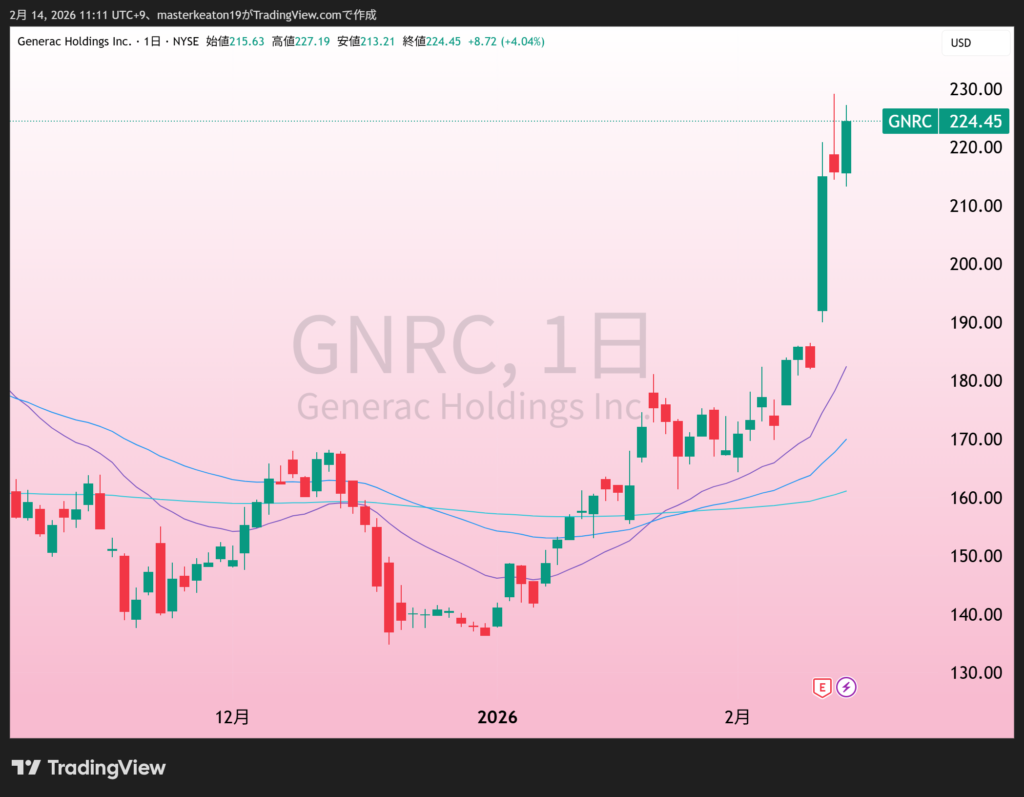 上昇トップはジェネラック・ホールディングス(GNRC)といって家庭用バックアップ電源を販売している会社です。