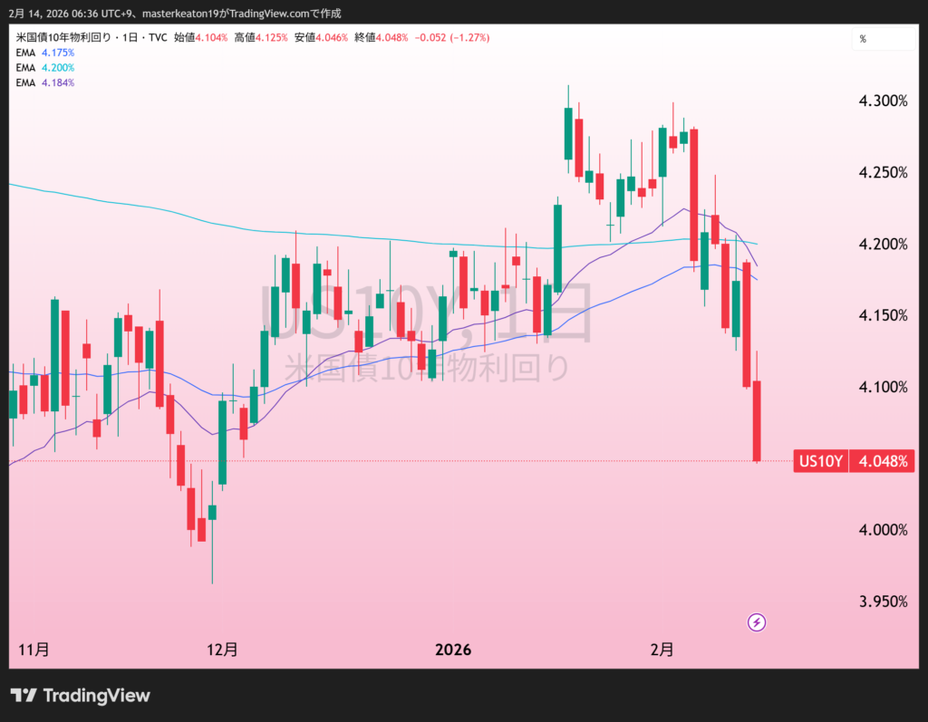 去年の11月末以来の数値で、今年は4.1~4.3のレンジで動いてました。