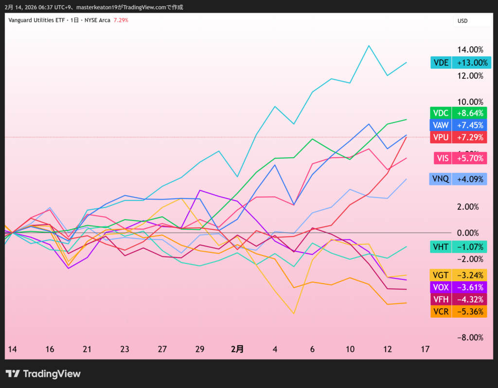 下図をご覧下さい。1か月のセクター毎の株価指数の推移です。