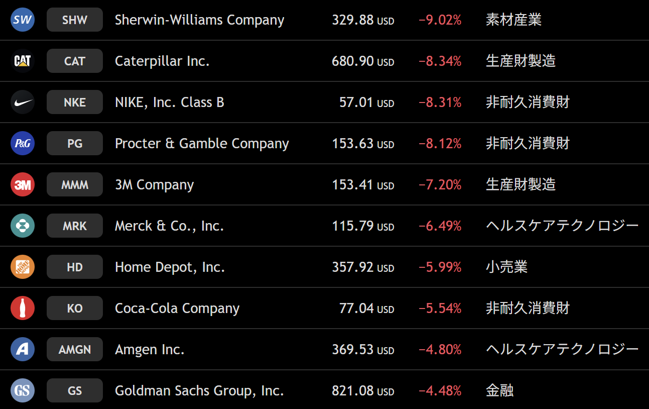 ダウ 週間下落ランキングトップ10
