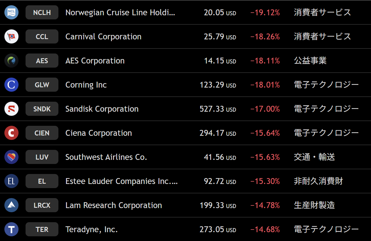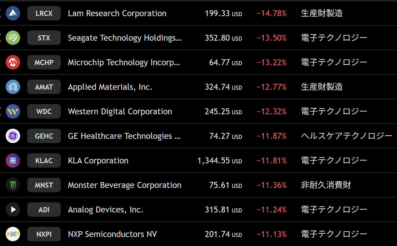 ナスダック 週間下落ランキングトップ10