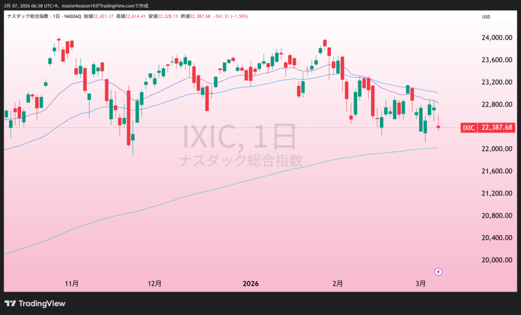 • ナスダックが-1.2%(22387.68)
