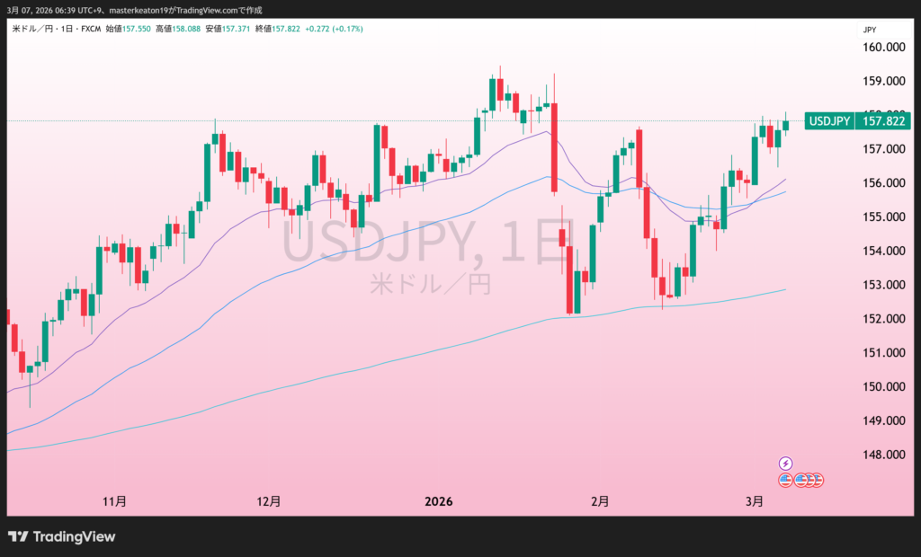 157.82円/ドルと先週から2円弱上昇です。