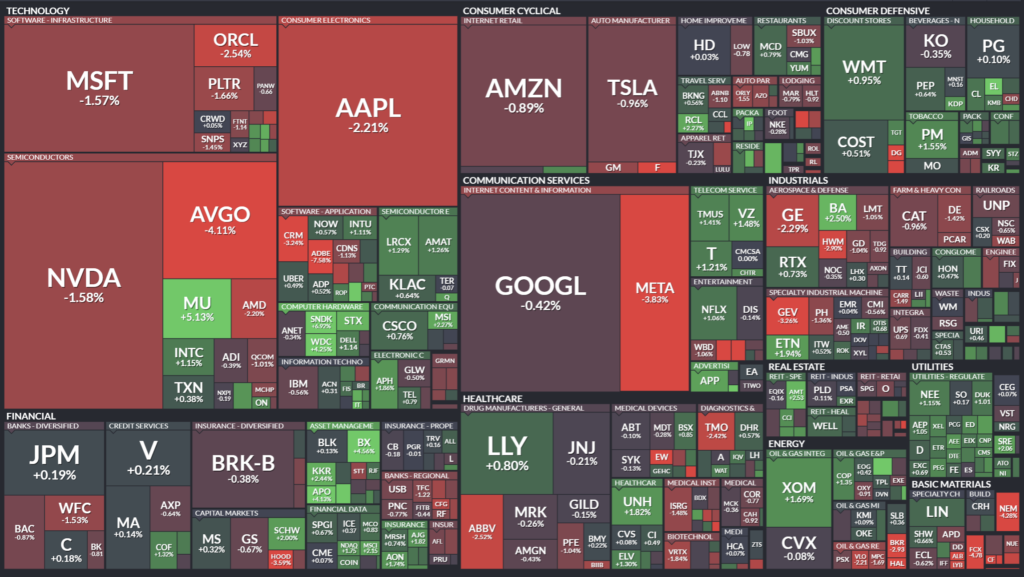 オラクルは決算が好調で株価が9%以上上昇。AIインフラやデータセンター需要の強さが確認された。一方で市場全体のリスク回避の流れから半導体株には売りも出た。