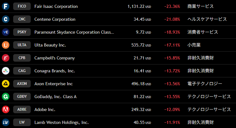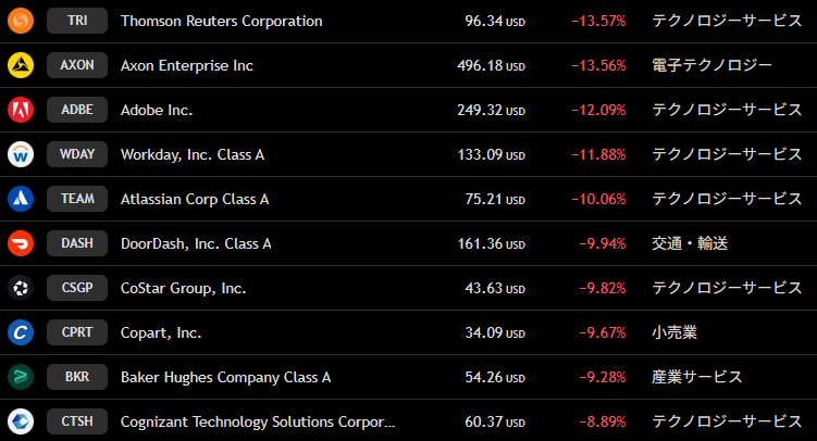 ナスダック 週間下落ランキングトップ10