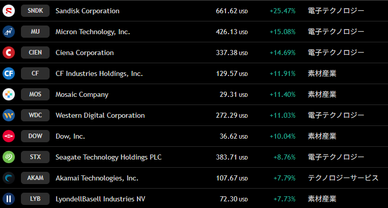上昇トップはサンディスク(SNDK)
