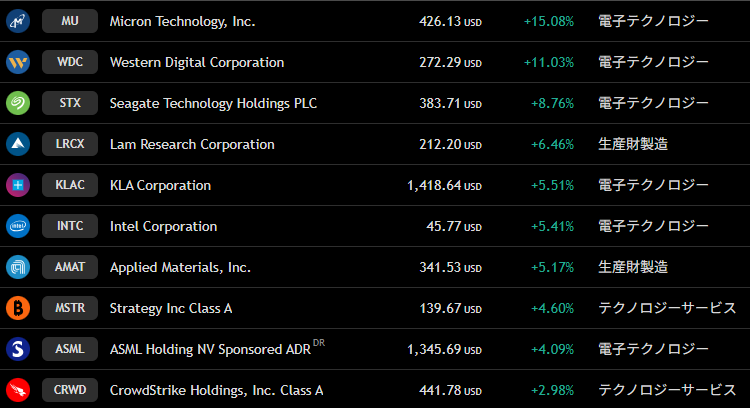 上昇トップはなんとマイクロン・テクノロジー(MU)