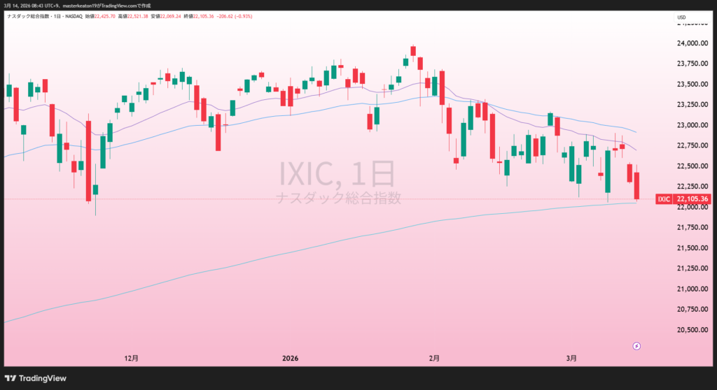 こちらもダウ、ナスダックと同様な動きで、これ以上悪材料が重なると200日線も下回りそうな勢いです。