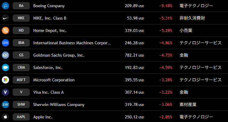 ダウ 週間下落ランキングトップ10