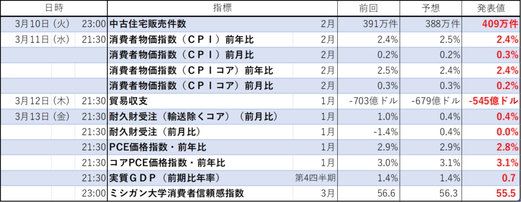今週のイベント結果(経済指標の結果)