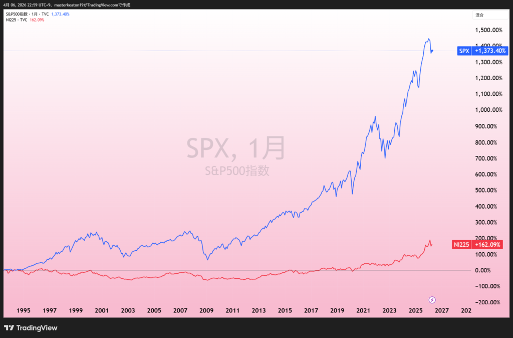 S&P500(米国株)=青 と NI225(日本株)=赤のチャート