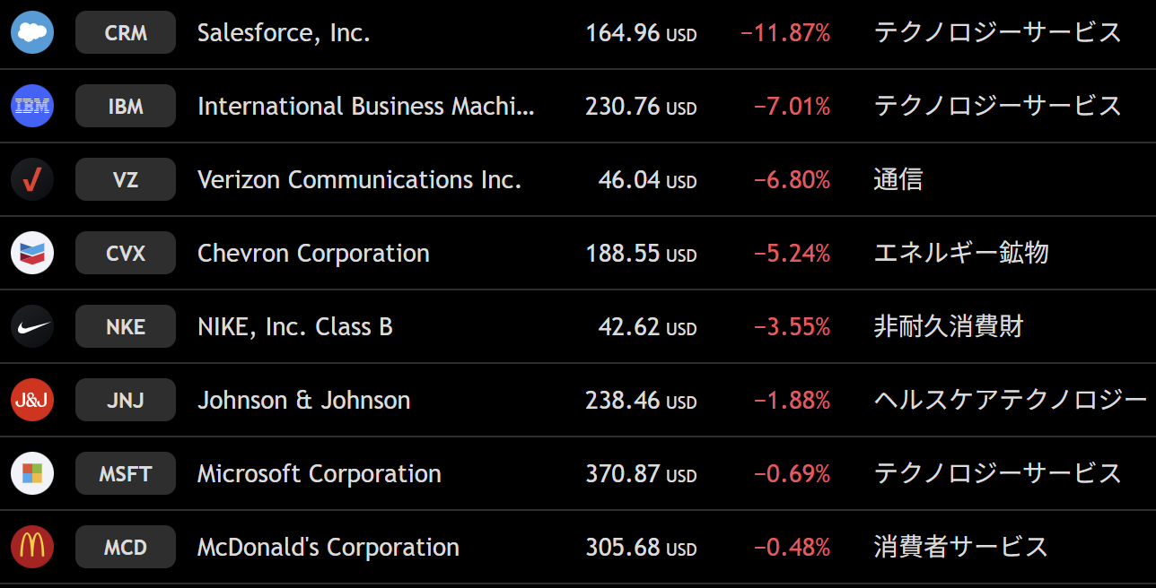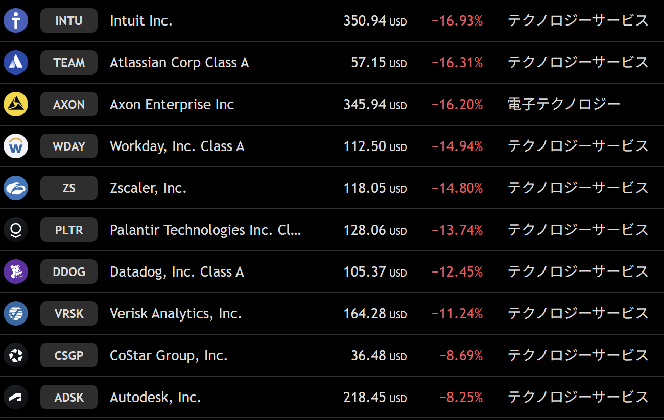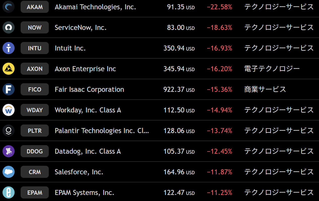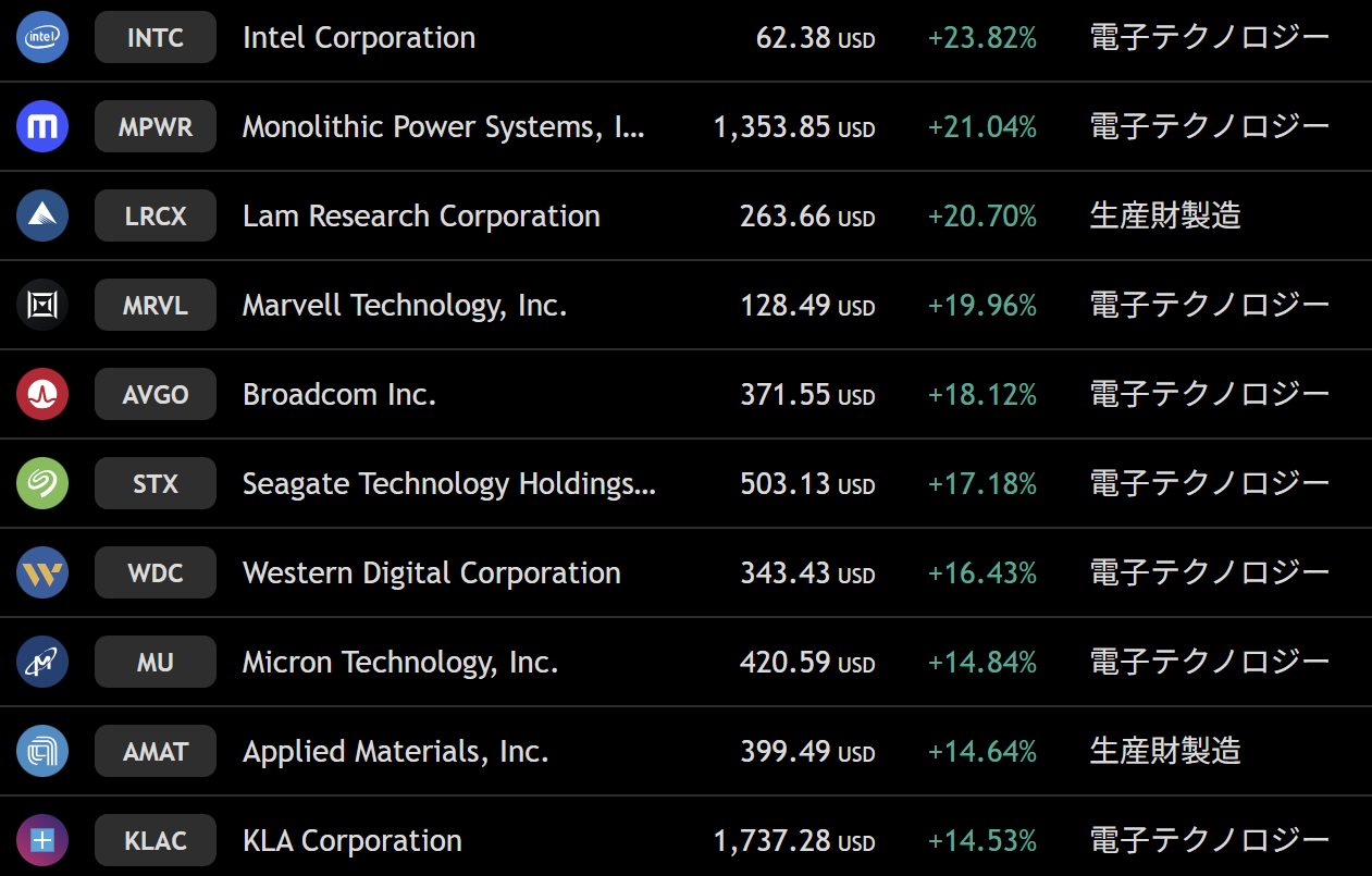 今週も全体的にリスクオン相場でしたが、このヒートマップを見る限り、どうも業種で明暗がくっきりしてきるようです。AI半導体銘柄が上昇、一方エネルギー、ソフトウェア関連銘柄が下落。