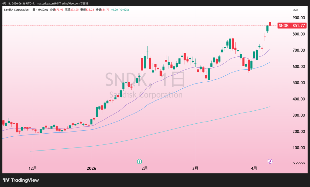 米・イラン停戦を受けたリスクオンとAIデータセンター需要を背景にNAND価格の上昇が続いており、投資家がSNDKの利益成長を改めて織り込み始めたとのことで上昇しました。