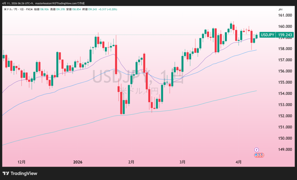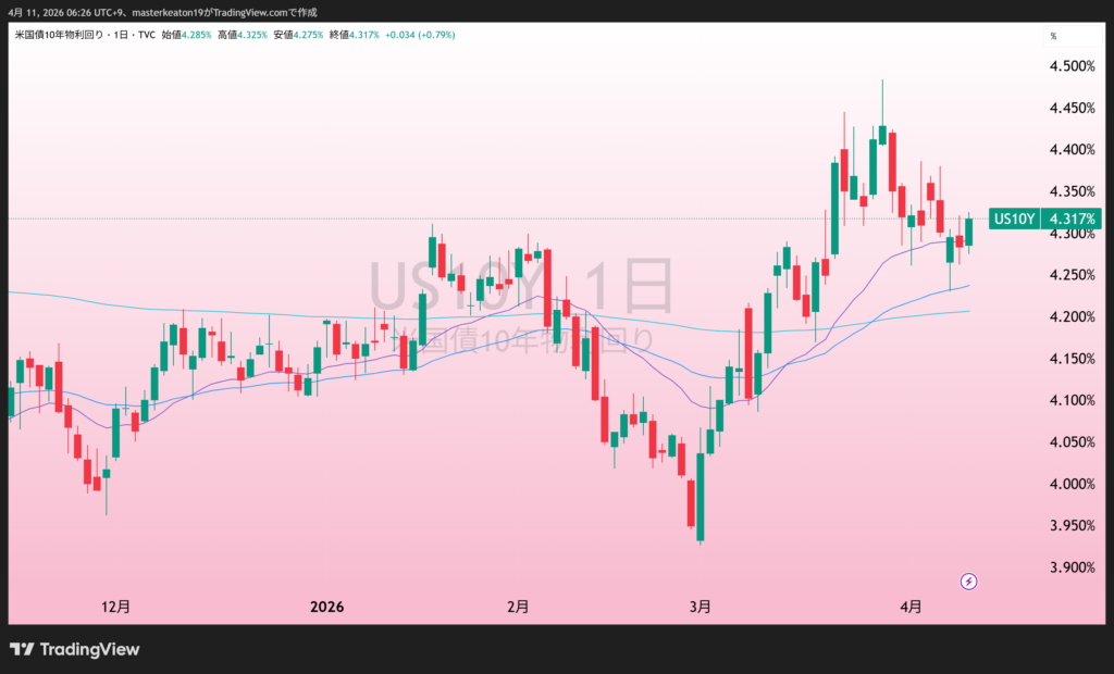 今週初めに下がってますがこれはまだ米国とイランを巡る緊張が強く不安から国債に資金が逃げたためです。そして昨日3月米消費者物価指数が発表され、総合CPIが前年比3.3%、エネルギーが前年比12.5%、ガソリンが前月比21.2%と強く、インフレ圧力が再確認されたのが週末上昇した要因ですね。