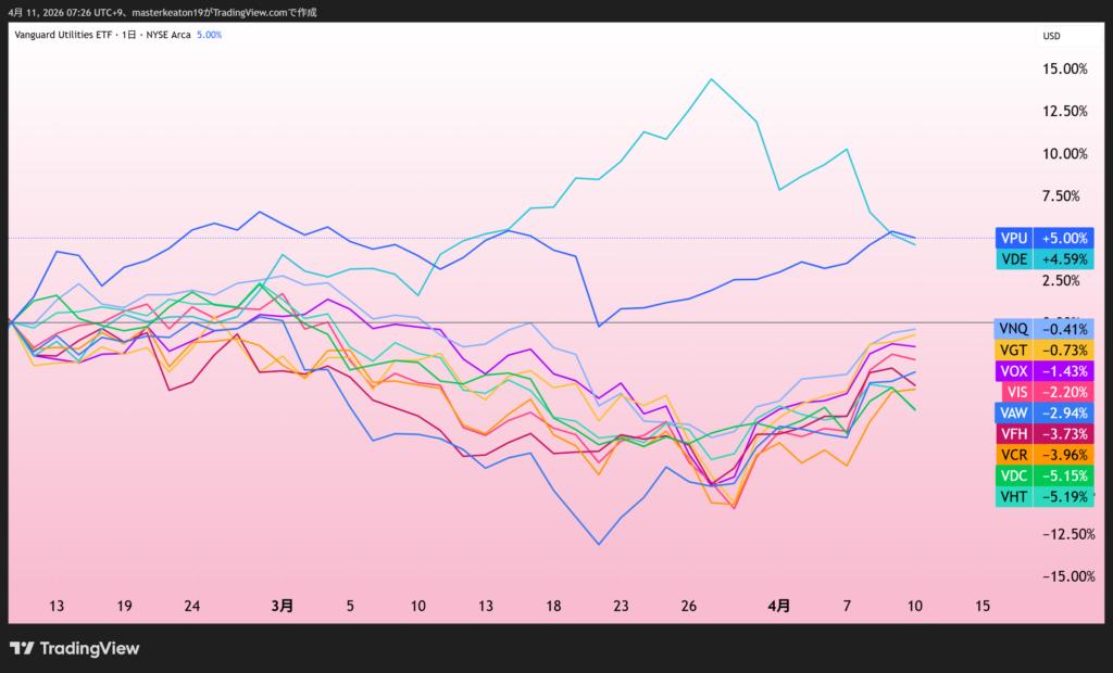 VDE(エネルギー)だけは下落基調、ほかはリスクオンで上昇してきてます。
